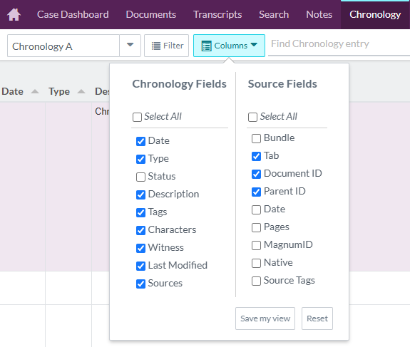- Columns - Press Columns dropdown and tick / untick to show / hide the viewable metadata fields applied to the chronology entries and / or applied to the hyperlinked source documents. Press Save to update the default view for the user.