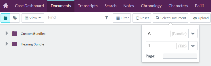 The Find tool within the Documents page allows users to run a basic search using the pagination value, being Bundle/Tab/Page as standard, to quickly find the relevant document.